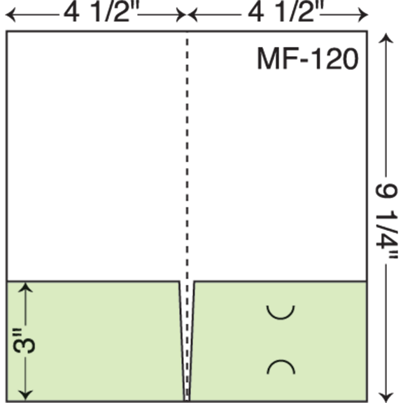 This style is a Mini Folder with two 3″ glued pockets, semicircle horizontal business card slits in the right pocket and single scored spine.