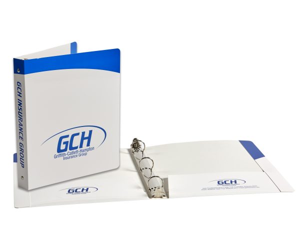 This style is a Paper Binder printed on 20 pt White stock, with two 4″ glued pockets, reinforced sides, a 1″ metal ring, and 4-corner horizontal business card slits in the left pocket. Binder Sheet Capacity on a 1″ ring is an estimate of approximate 200 sheets.