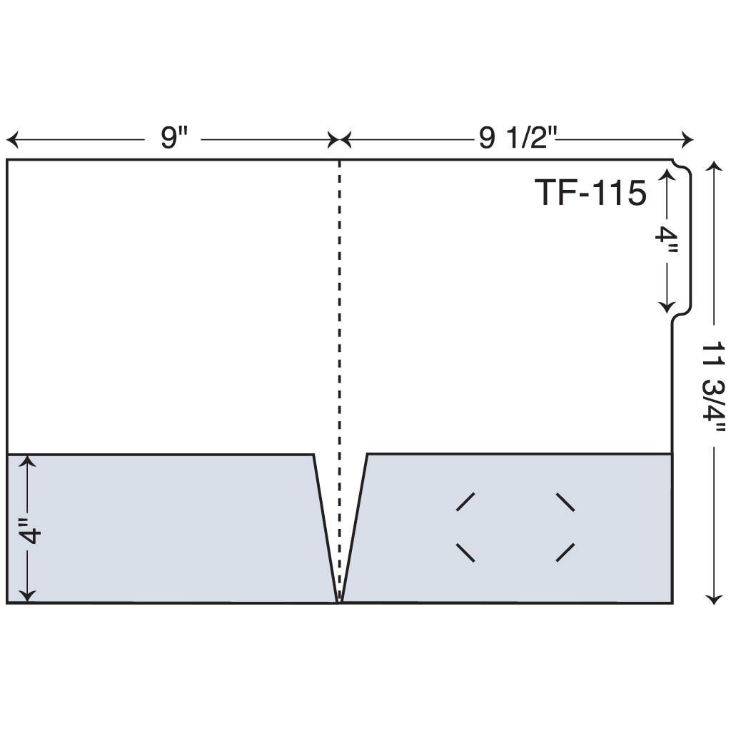 Letter size double pocket presentation folders with tab extension on back panel. Single scored spine. Two pockets. Single thickness tab on right panel.